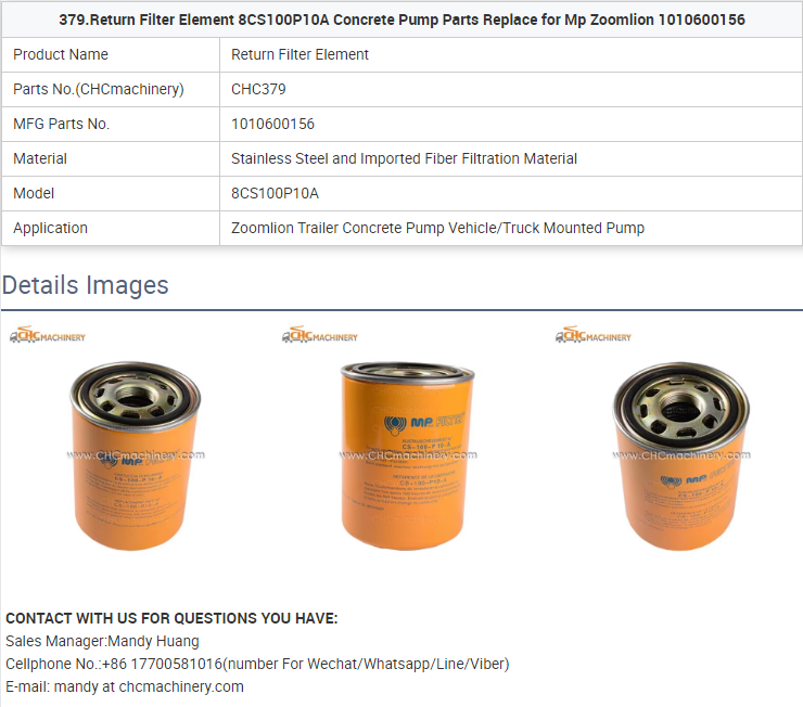 - 379.Return Filter Element 8CS100P10A Concrete Pump Parts Replace for Mp Zoomlion 1010600156