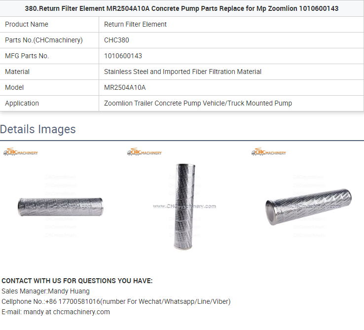 - 380.Return Filter Element MR2504A10A Concrete Pump Parts Replace for Mp Zoomlion 1010600143