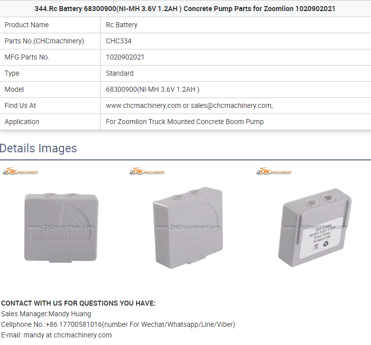 - 344.Rc Battery 68300900(NI-MH 3.6V 1.2AH ) Concrete Pump Parts for Zoomlion 1020902021