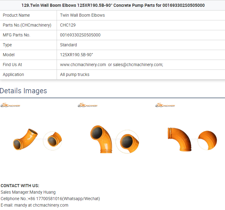 - 129.Twin Wall Boom Elbows 125XR190.5B-90° Concrete Pump Parts for 001693302S0505000